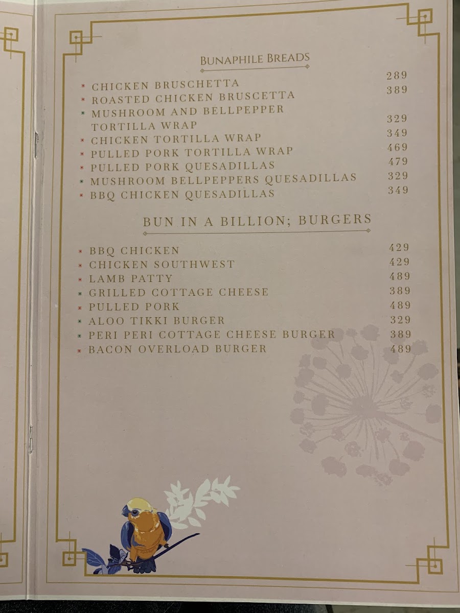 The menu celebrates all-day breakfast with delightful offerings like the English Breakfast (₹429) and the indulgent Bunaphile Special Breakfast (₹449). For those craving something heartier, the non-veg main courses shine with dishes like Chicken Ala Kiev (₹489) and Mushroom and Chicken Risotto (₹429).